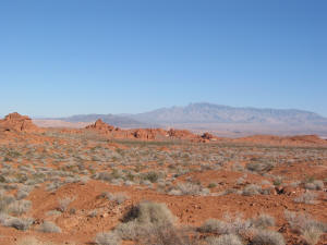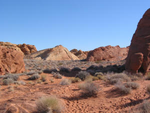there is scrub and little shrubs and then big red rocks jutting out of the